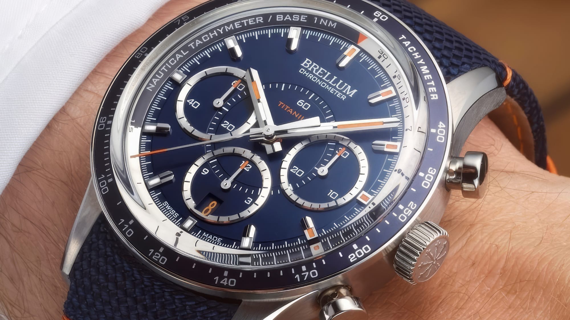 The dial is the highlight. Brellum captured a maritime feel with deep blues and orange accents on the chronograph hands. It gets noticed but remains easy to read. The tricompax layout is clean and well-balanced.