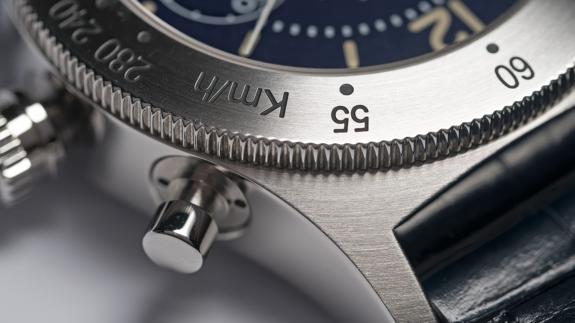 Panerai calls this a blue dial, but to my eye it is the black of midnight sea. Under bright daylight or direct sunlight, a subtle indigo undertone emerges, revealing its intended color. Indoors, though, it is a deep graphite-black, absorbing light rather than reflecting it. The tachymeter scale runs cleanly along the bezel, printed in white to echo the crisp numerals of the subdials.