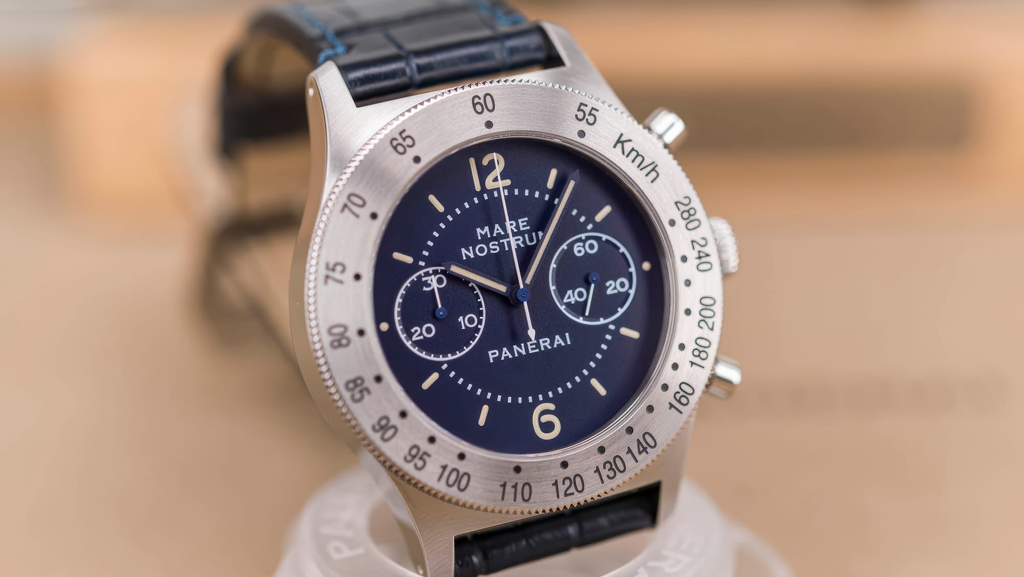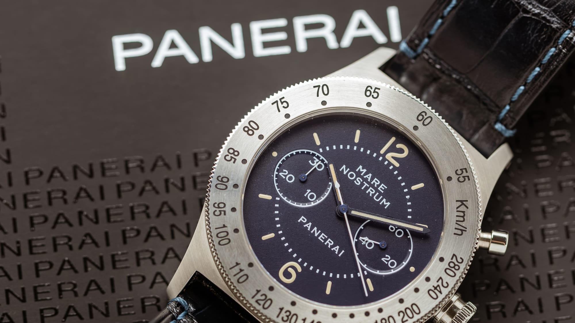 The design is textbook Panerai minimalism: no date, no extraneous text, only “Mare Nostrum” in restrained capital letters beneath twelve. The small seconds at nine and the 30-minute chronograph counter at three are perfectly symmetrical, giving the dial a balance absent in most modern chronographs. The hands are stick-shaped and filled with Grade A Super-LumiNova, whose tone is slightly off-white, more ivory than green.