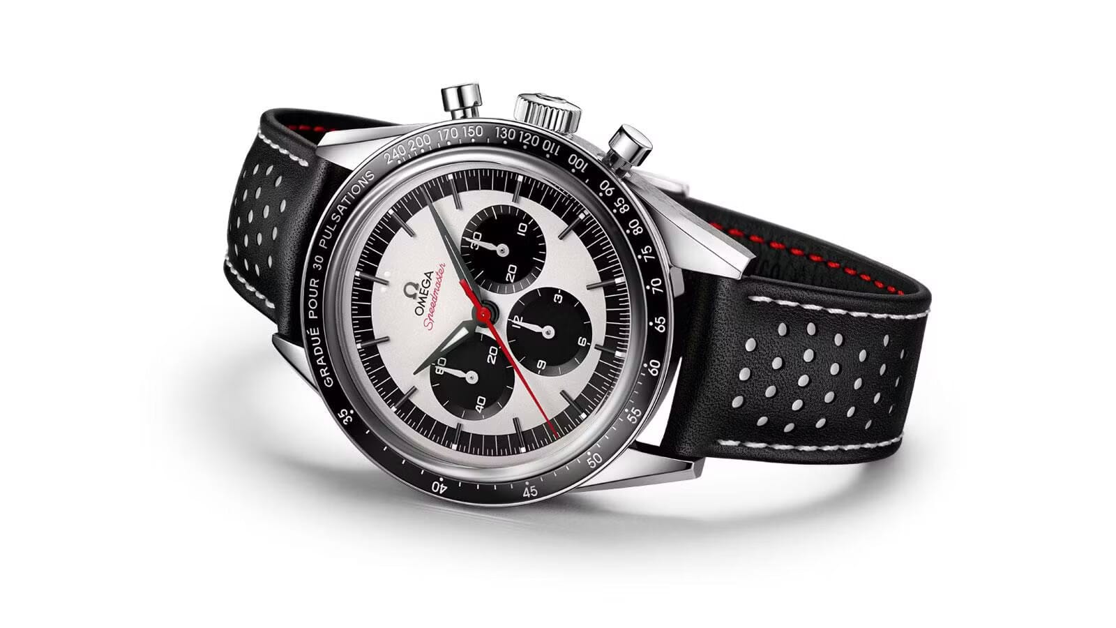 The bezel is black ceramic with a white enamel pulsometer scale. Most Speedmasters use a tachymeter, which measures speed over a known distance. The pulsometer measures heart rate: start the chronograph, count fifteen pulse beats, and the seconds hand points to the beats-per-minute value on the scale. Doctors used this in the field before digital monitors existed. On the CK2998 it's more of a design feature than a practical tool, but it sets the watch apart from every other Speedmaster on the shelf.
