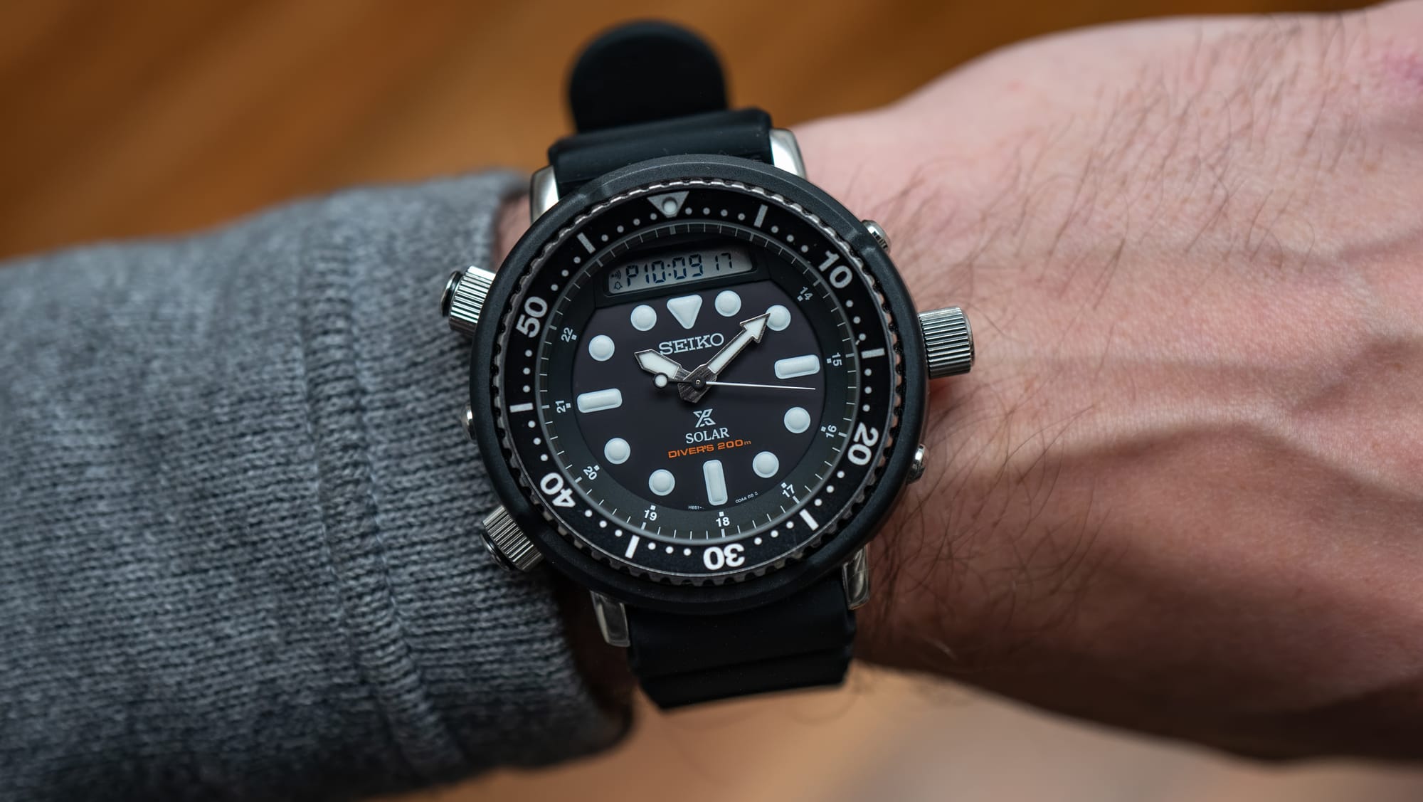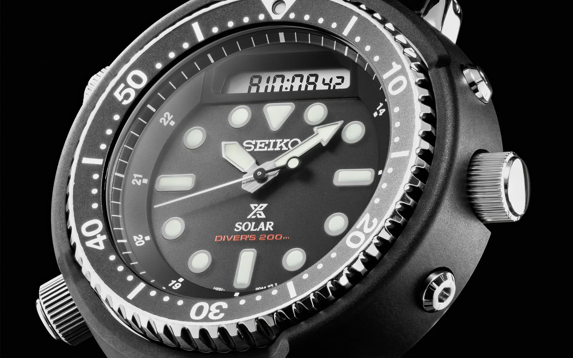 In 1982, Seiko released the H558-5000. It was the world's first dive watch to combine an analog display with a digital readout that included both a chronograph and an alarm. The case measured roughly 46mm including the shroud, was water resistant to 150 meters, and had been tested to operate in temperatures ranging from -40 to 60 degrees Celsius. Seiko built this watch for people who would actually use it in extreme conditions. Japanese expedition teams wore it climbing Everest. It went to both the North and South Poles.