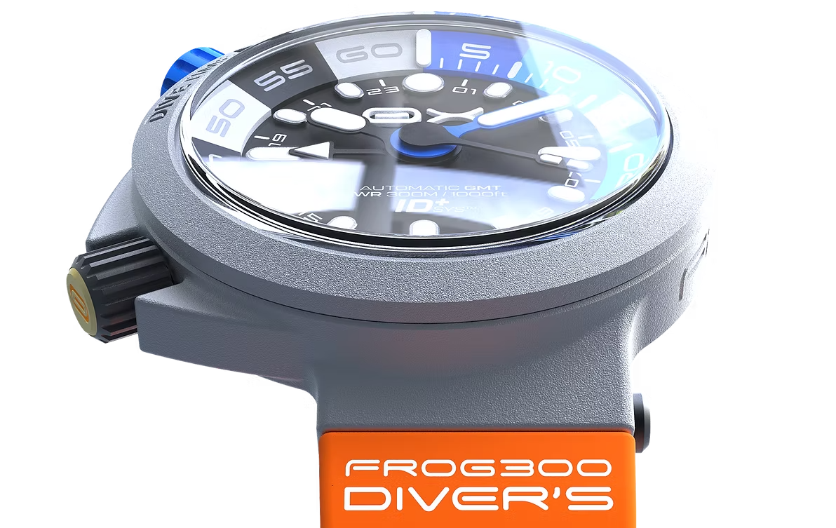Water resistance is rated to 300 meters. The FROG300 is ISO 6425 certified for saturation diving and also complies with MIL-STD-810H. It has a helium escape valve and a double-curved sapphire crystal with blue AR coating on the inner face. The crystal is 3.05mm thick.